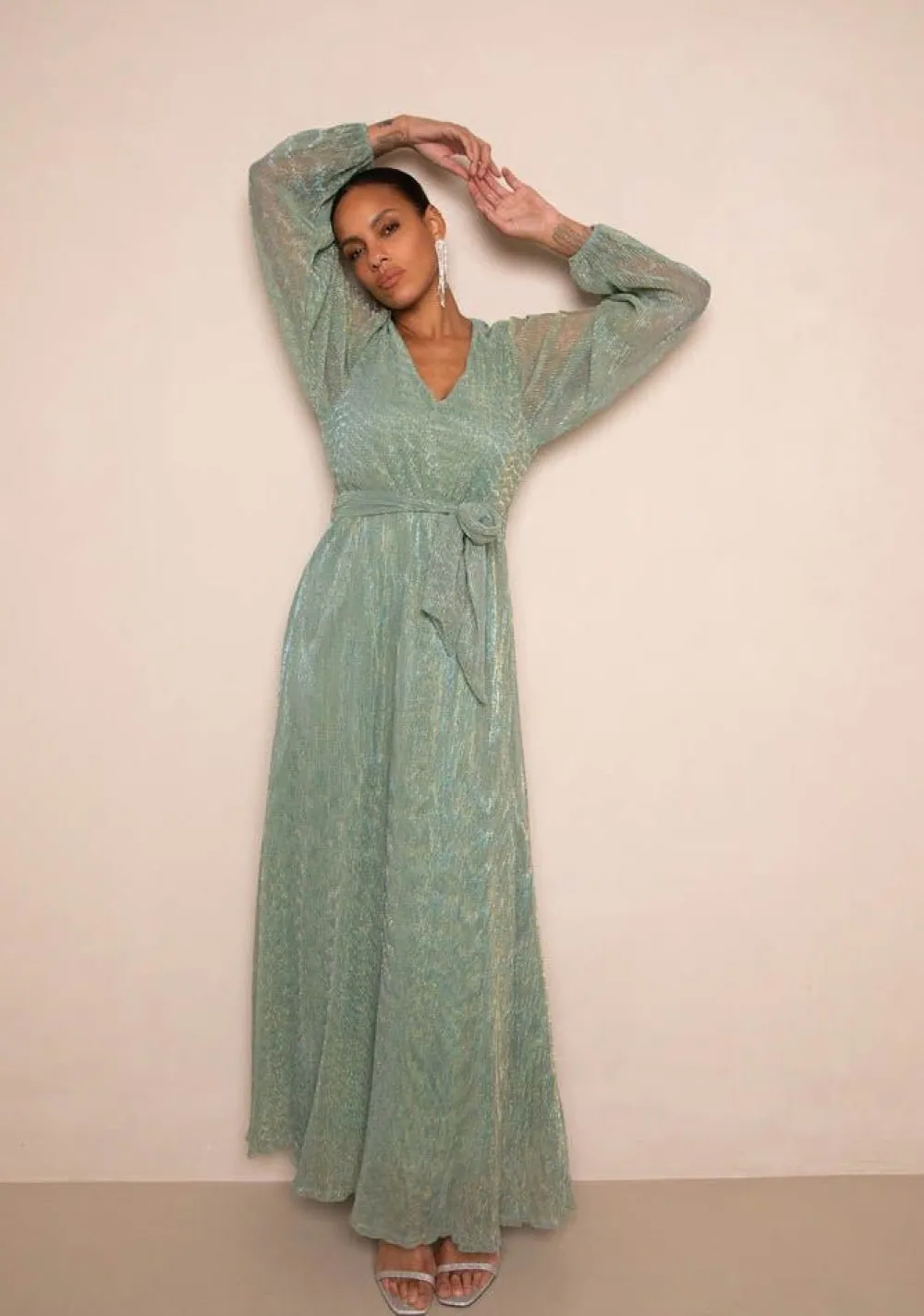 – Het model is 1.75m lang en draagt maat S