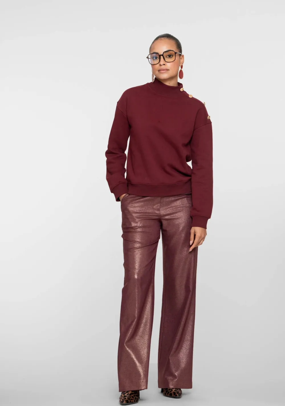 – Het model is 1.76m lang en draagt maat S