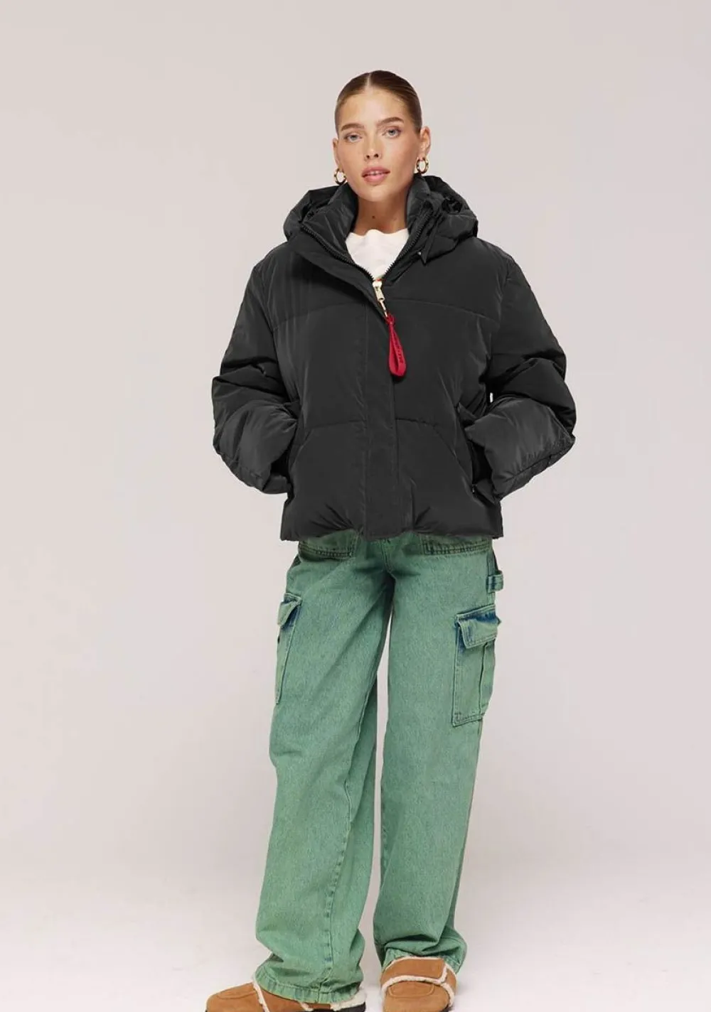 – Het model is 1.74m lang en draagt maat S