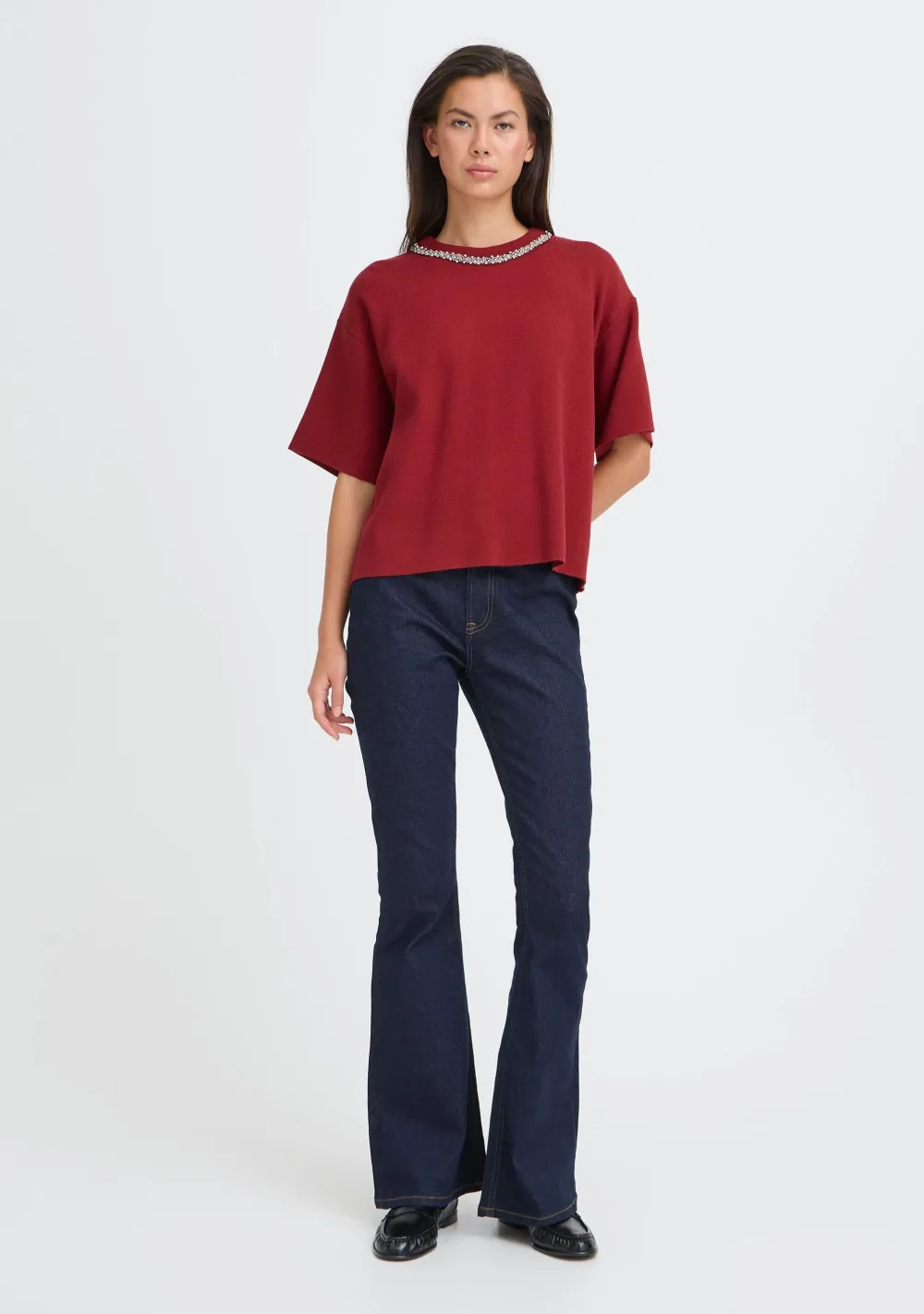 – Het model is 1.76m lang en draagt maat S
