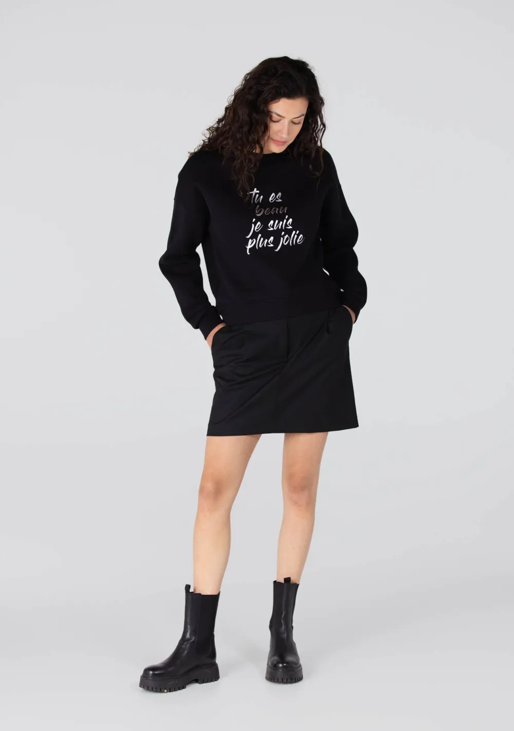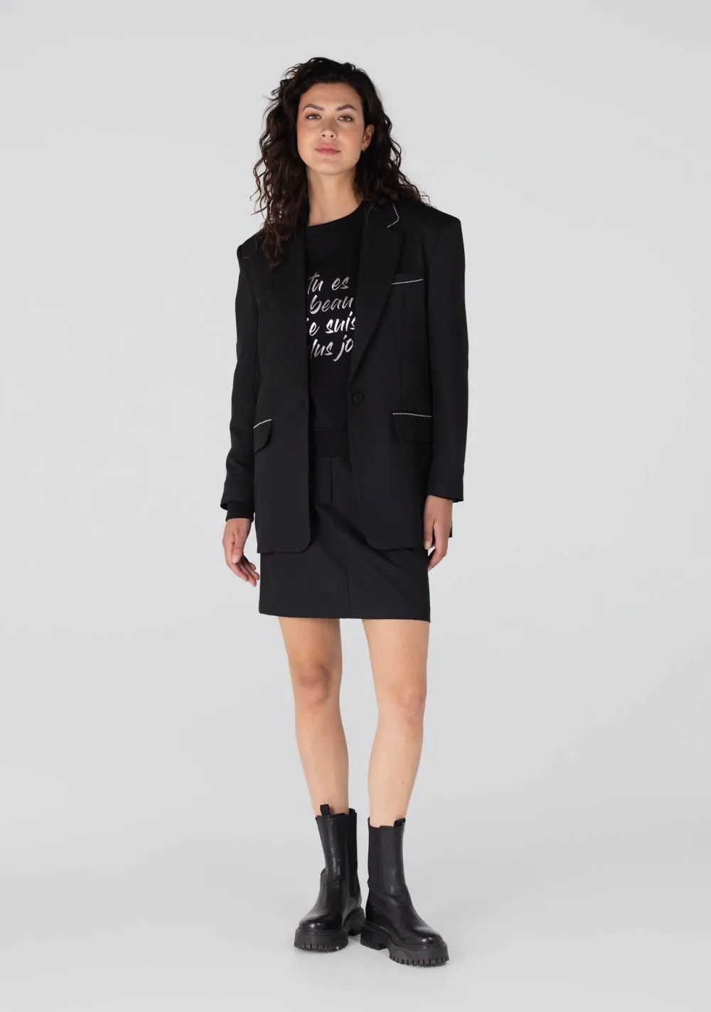 – Het model is 1.78m lang en draagt maat S