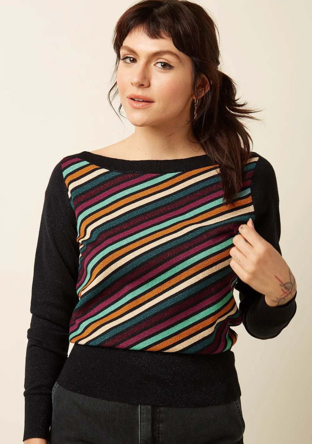 – Het model is 1.75m lang en draagt maat S
