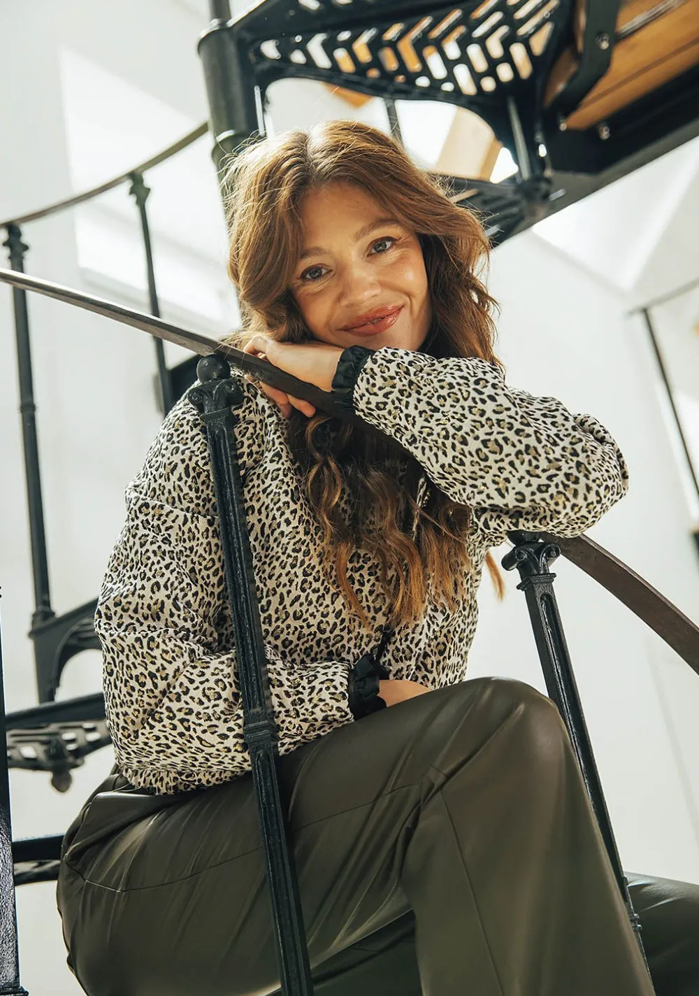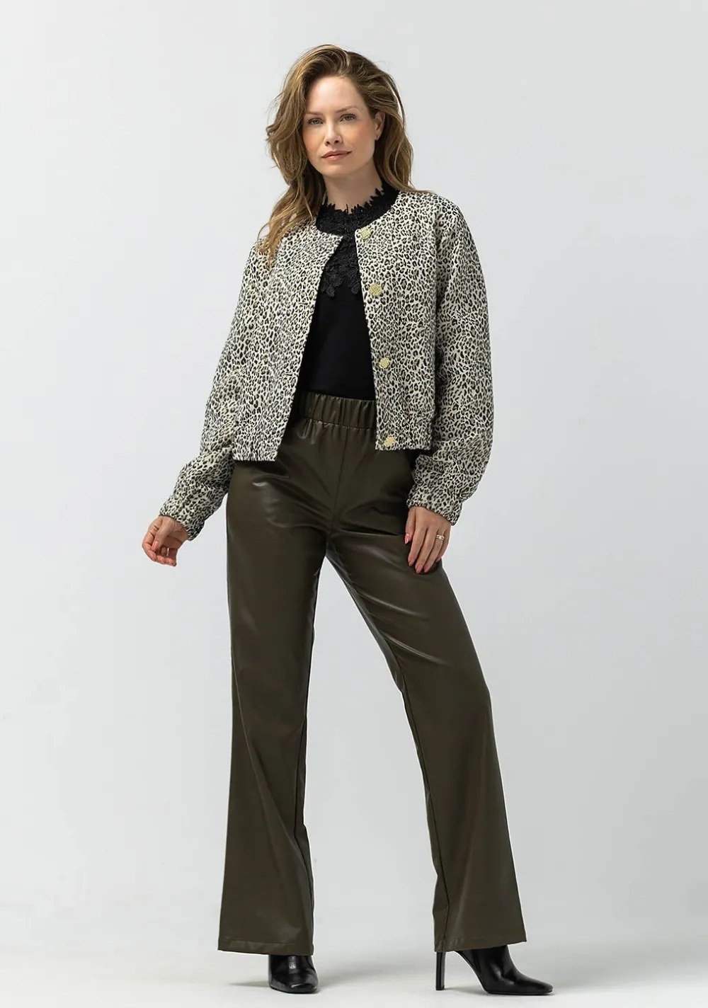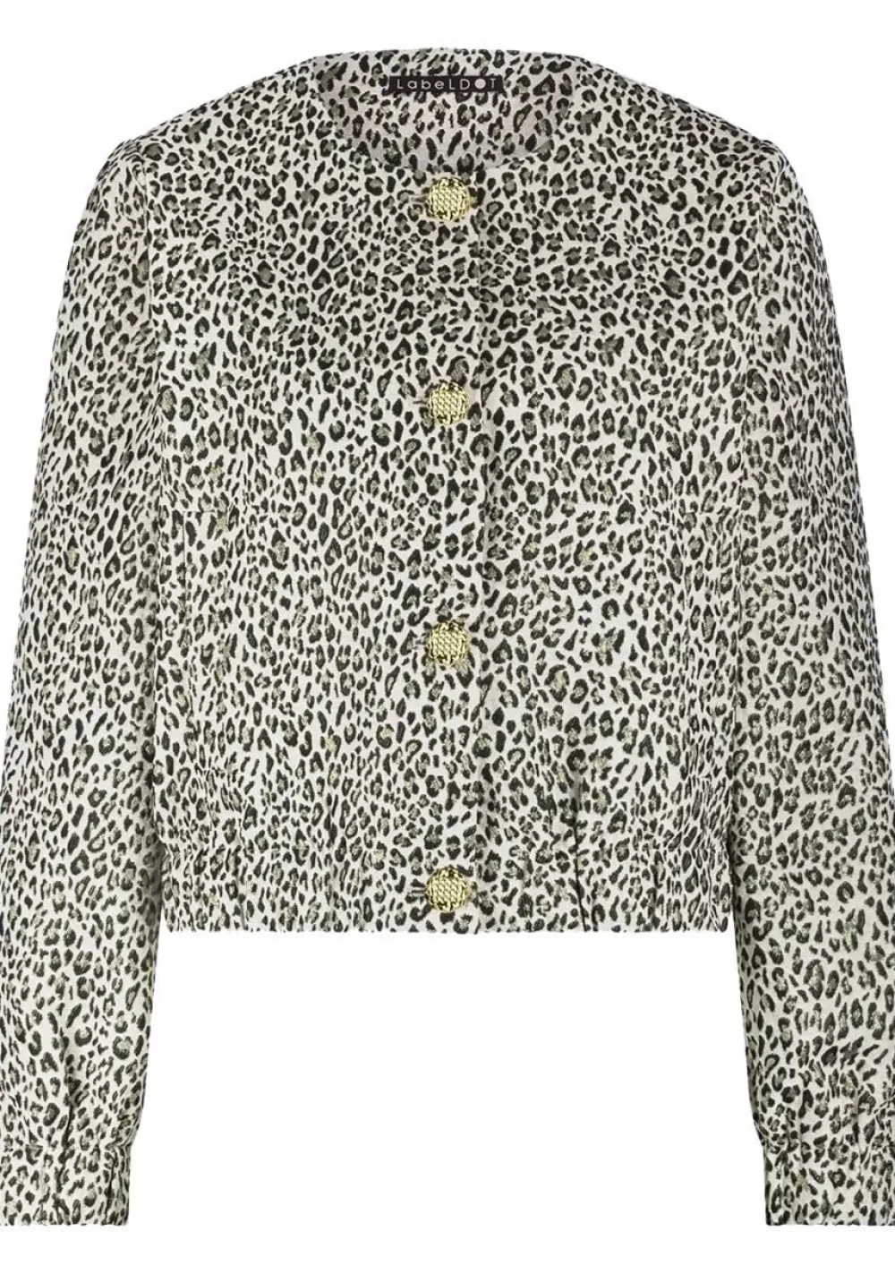 – Luipaard geprinte Debora jasje is afgewerkt met elastische boorden en steekzakken. De stof is afgewerkt met een lurex draad voor een speels detail