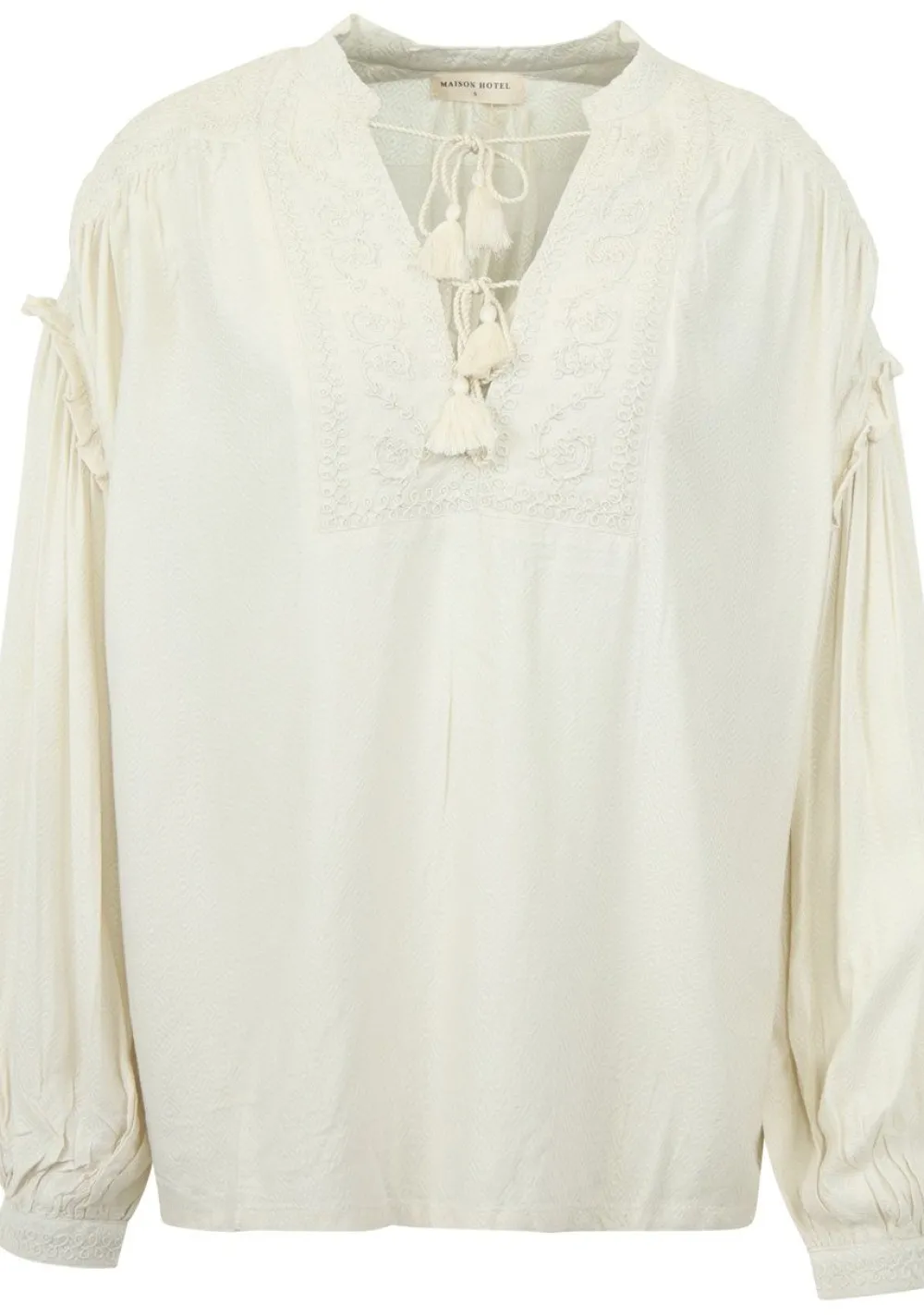 – Blouse afgewerkt met borduursels en een strik detail aan de voorzijde. De mouwen zijn afgewerkt met een ballon accent