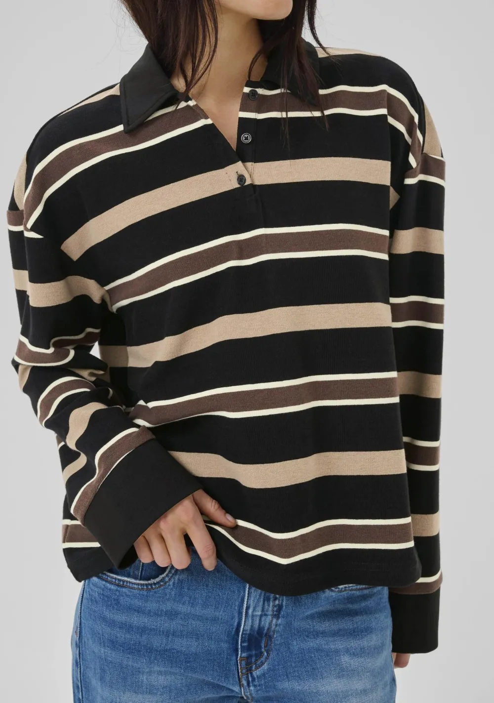 – Het model is 1.76m lang en draagt maat S