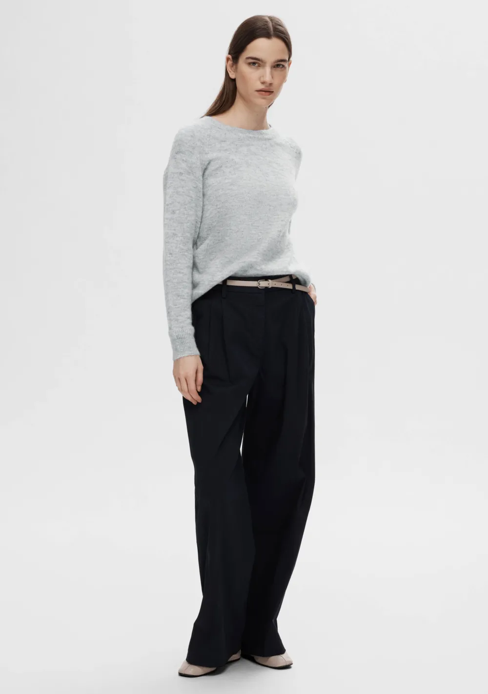 – Het model is 1.76m lang en draagt maat S