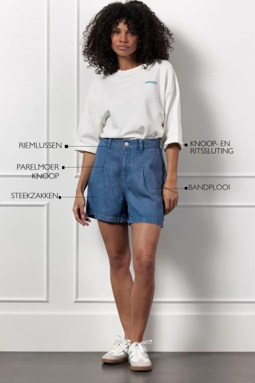 – Het model is 1.76m lang en draagt maat S