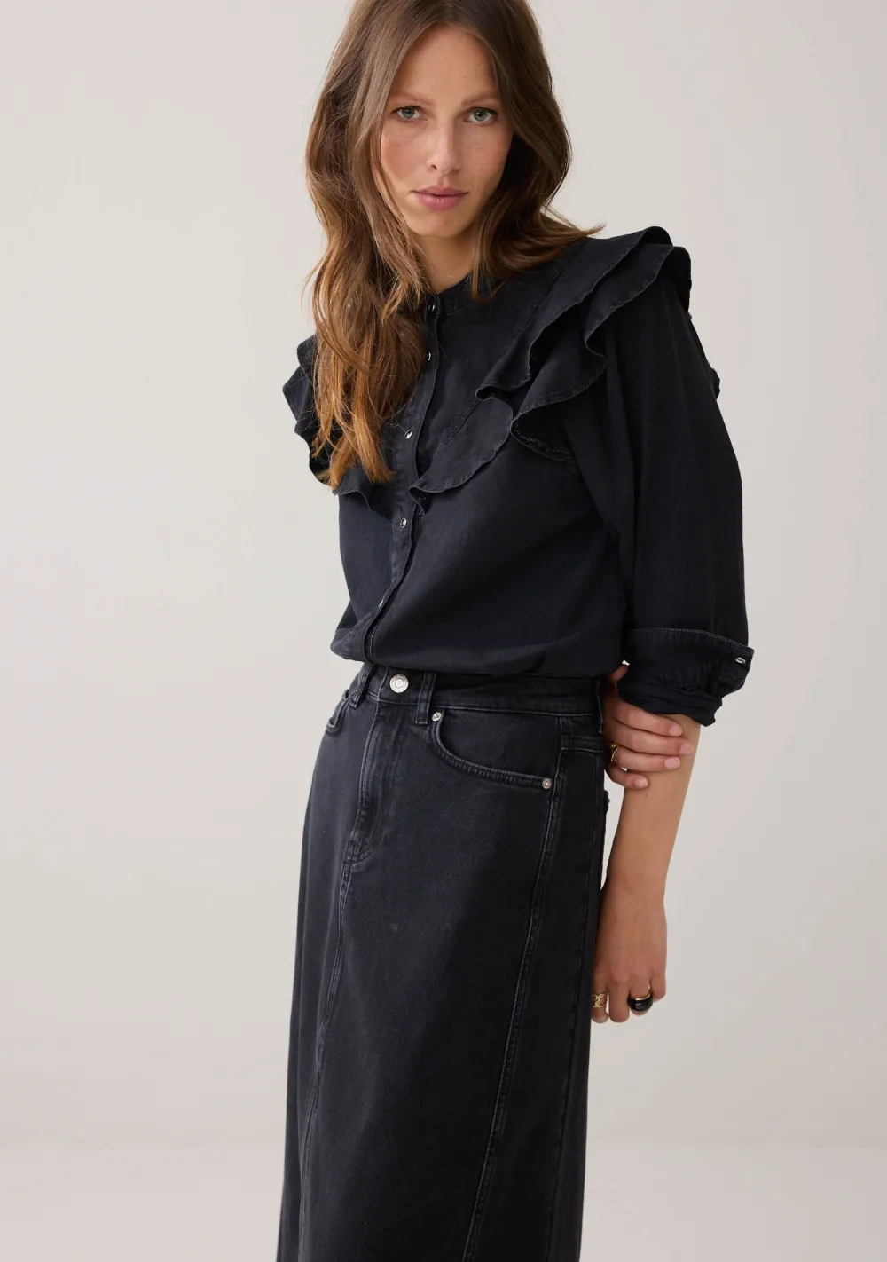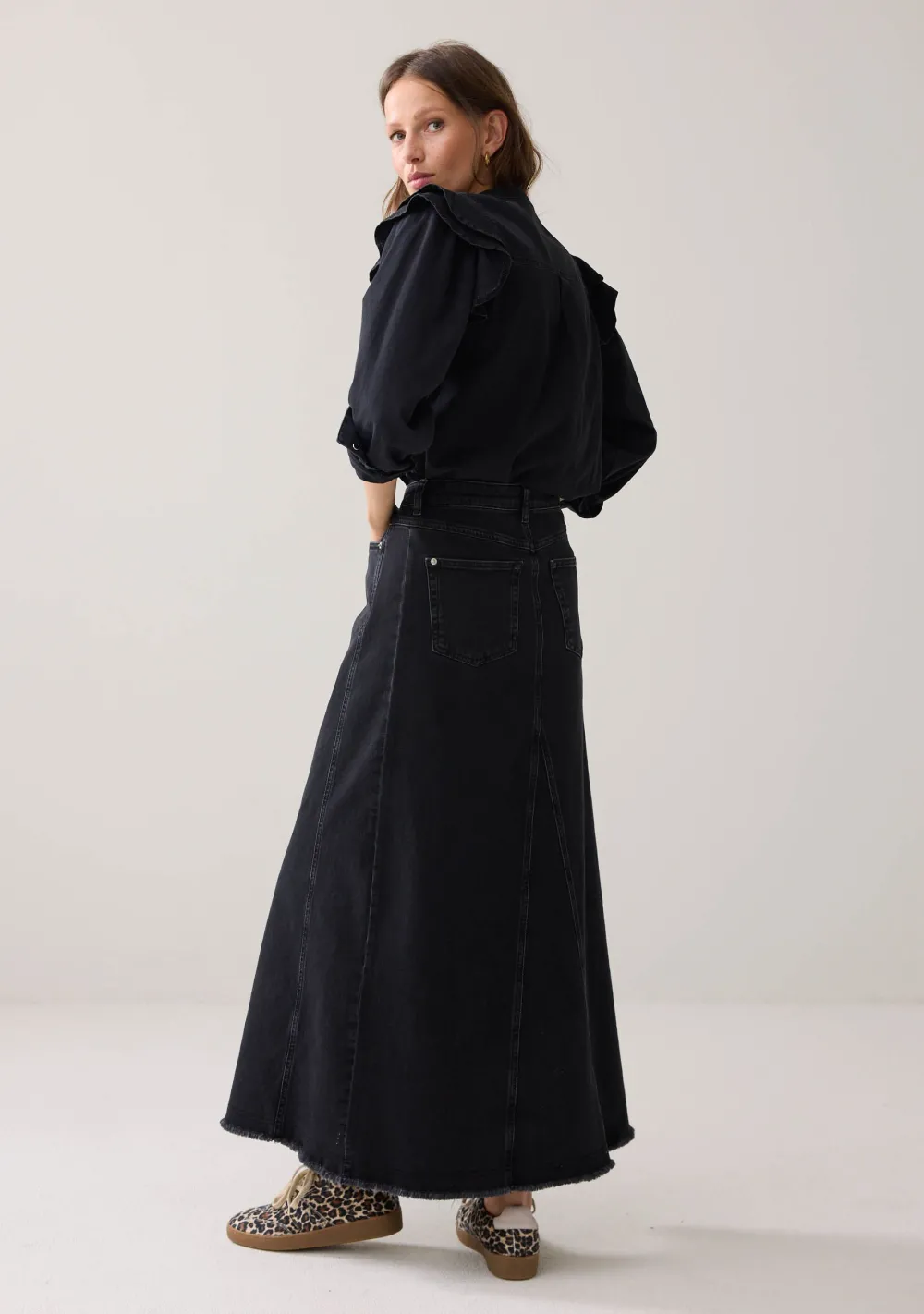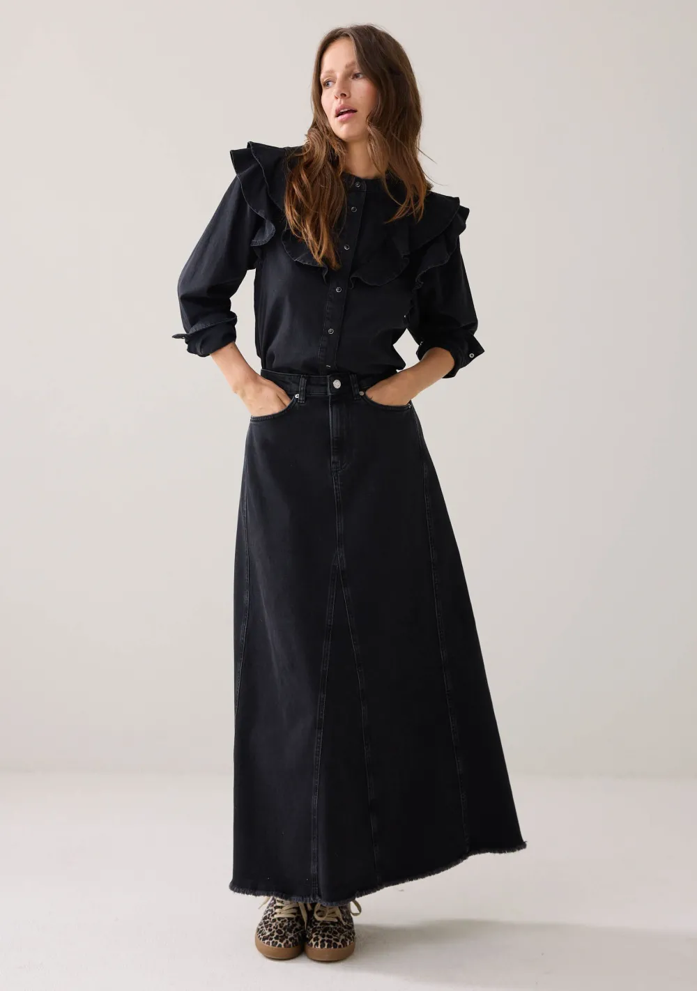 – Het model is 1.76m lang en draagt maat 36