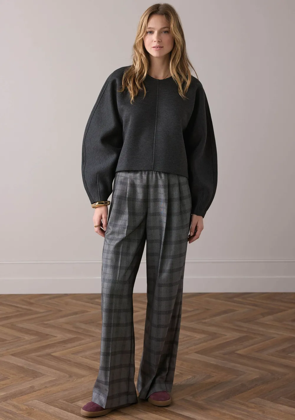 – Het model is 1.76m lang en draagt maat S