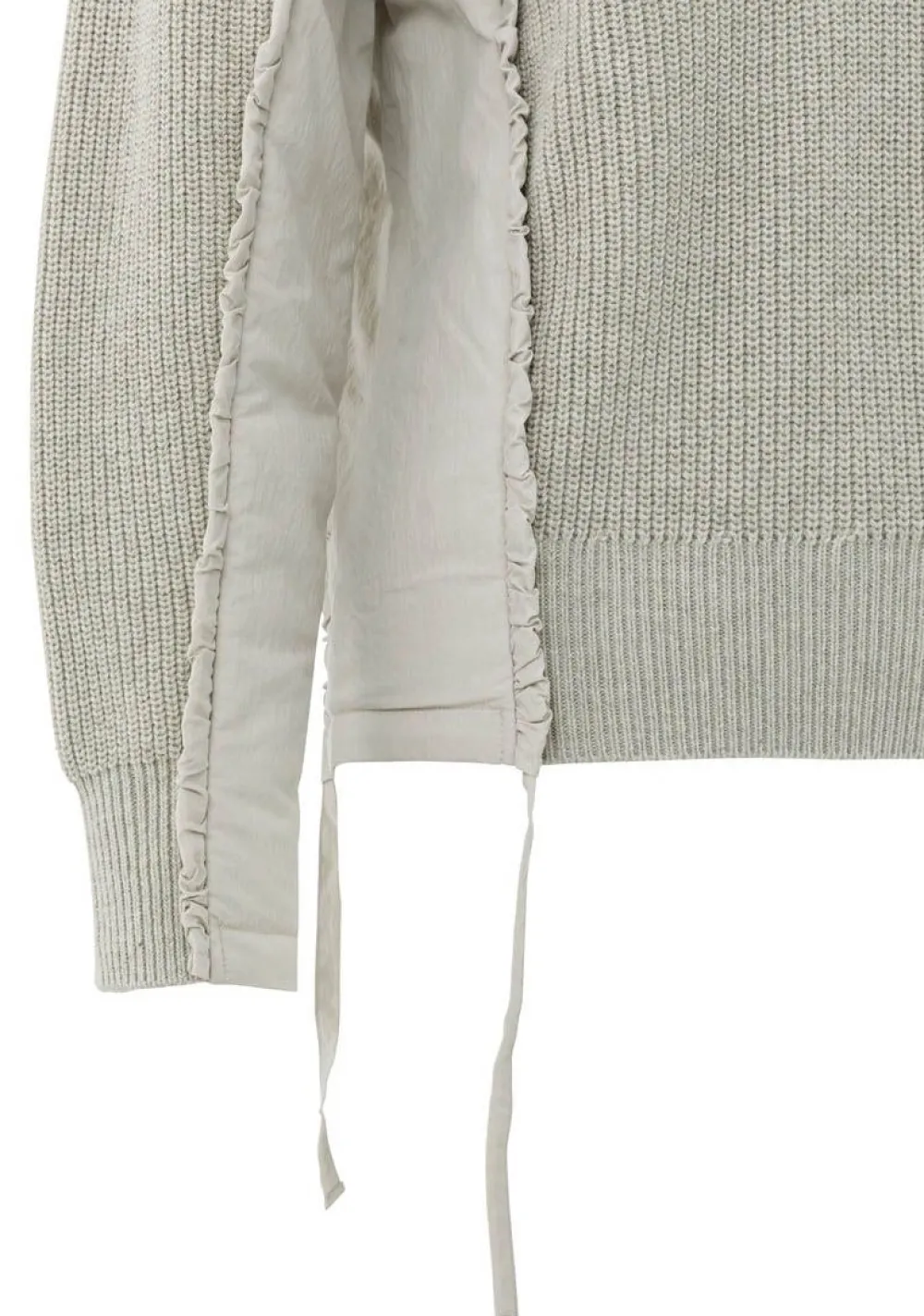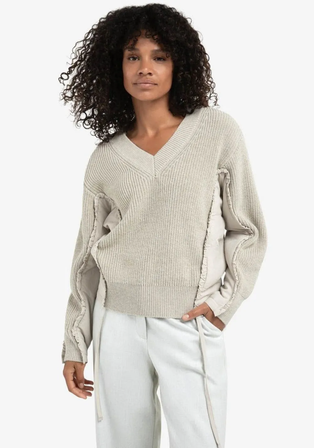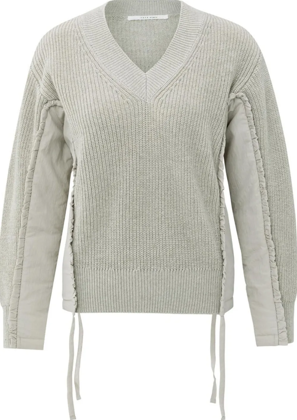 – Trui, afgewerkt in verschillende stoffen/structuren, is voorzien van een speels strikdetail in de zijnaad