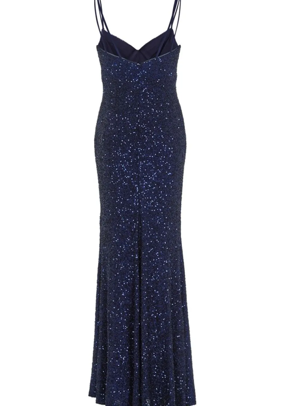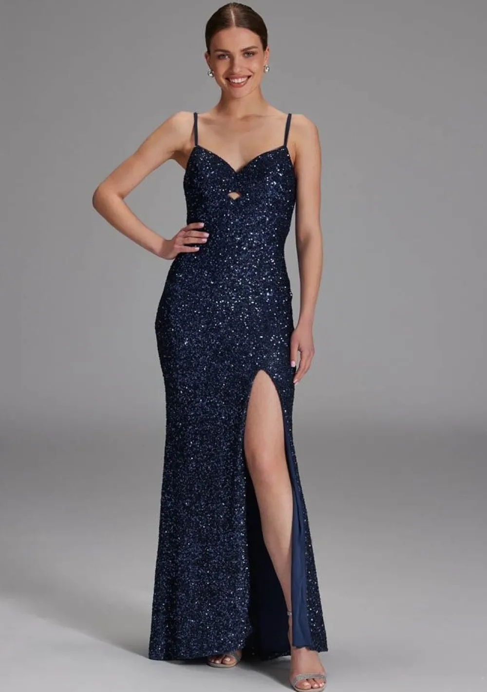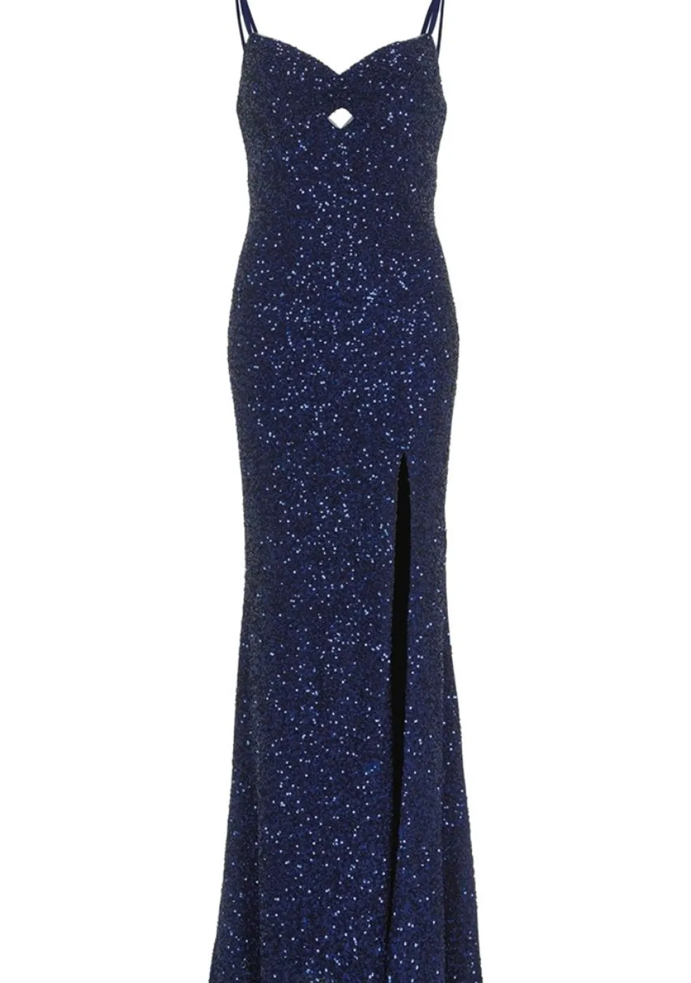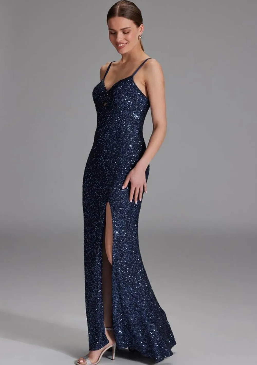 – De jurk is afgewerkt met een pailletten detail en een split in de zijnaad