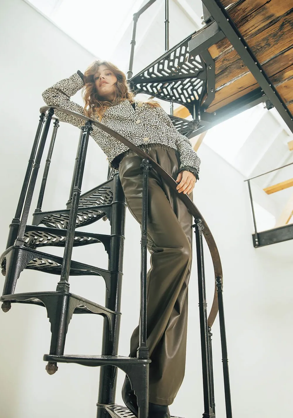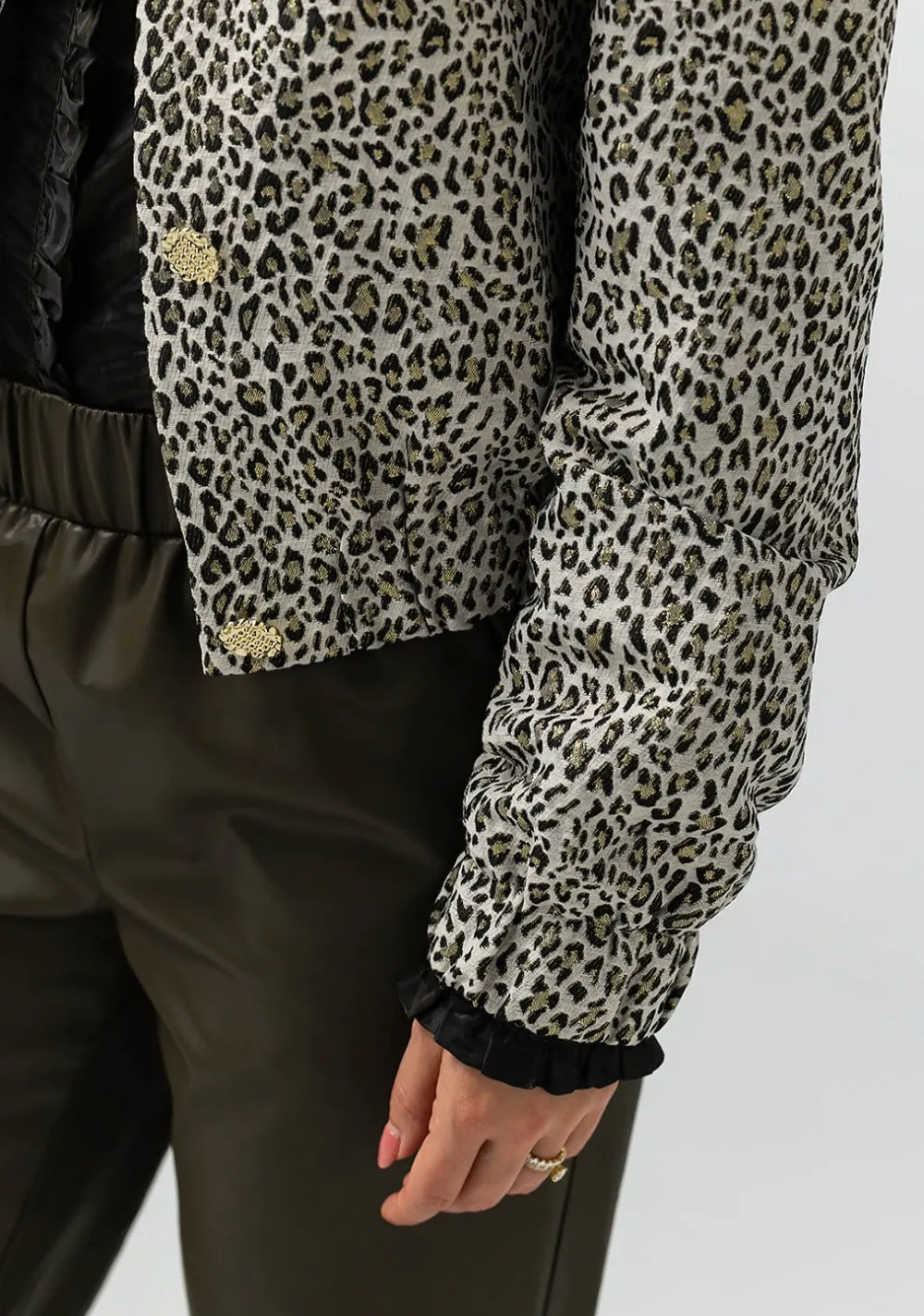 – Luipaard geprinte Debora jasje is afgewerkt met elastische boorden en steekzakken. De stof is afgewerkt met een lurex draad voor een speels detail