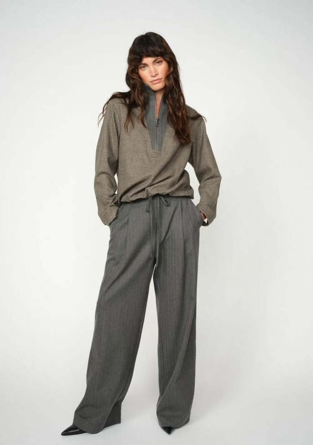 – Het model is 1.76m lang en draagt maat S