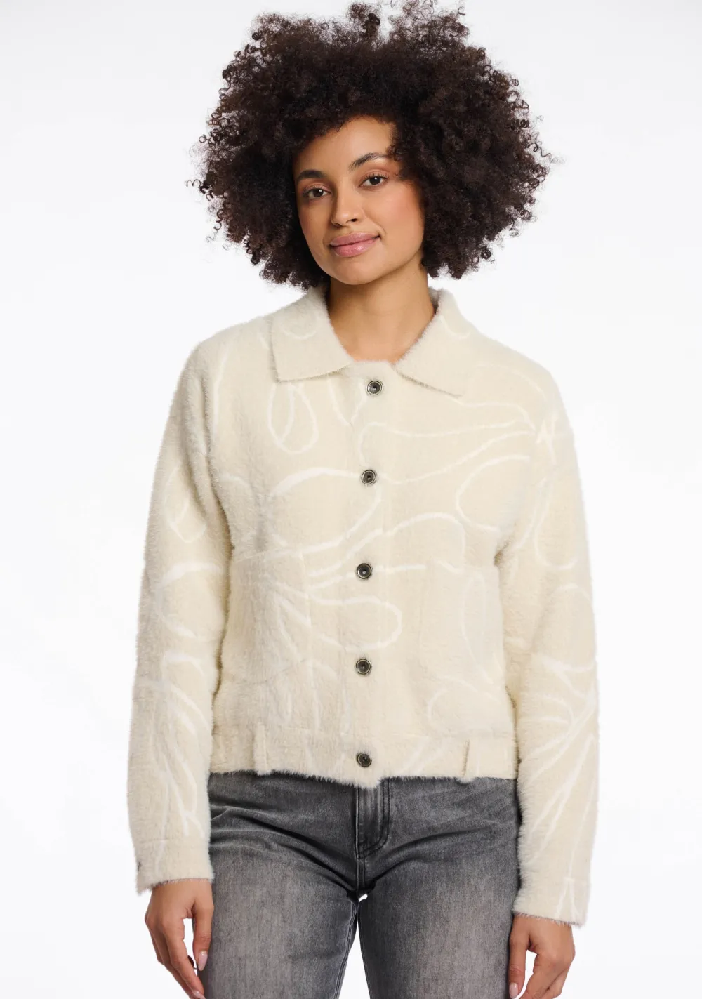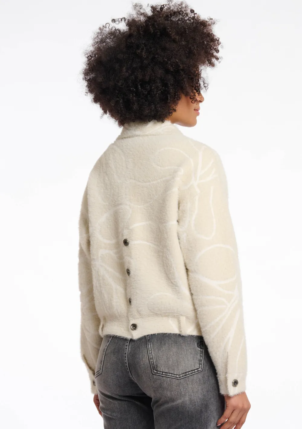 – Het model is 1.76m lang en draagt maat S