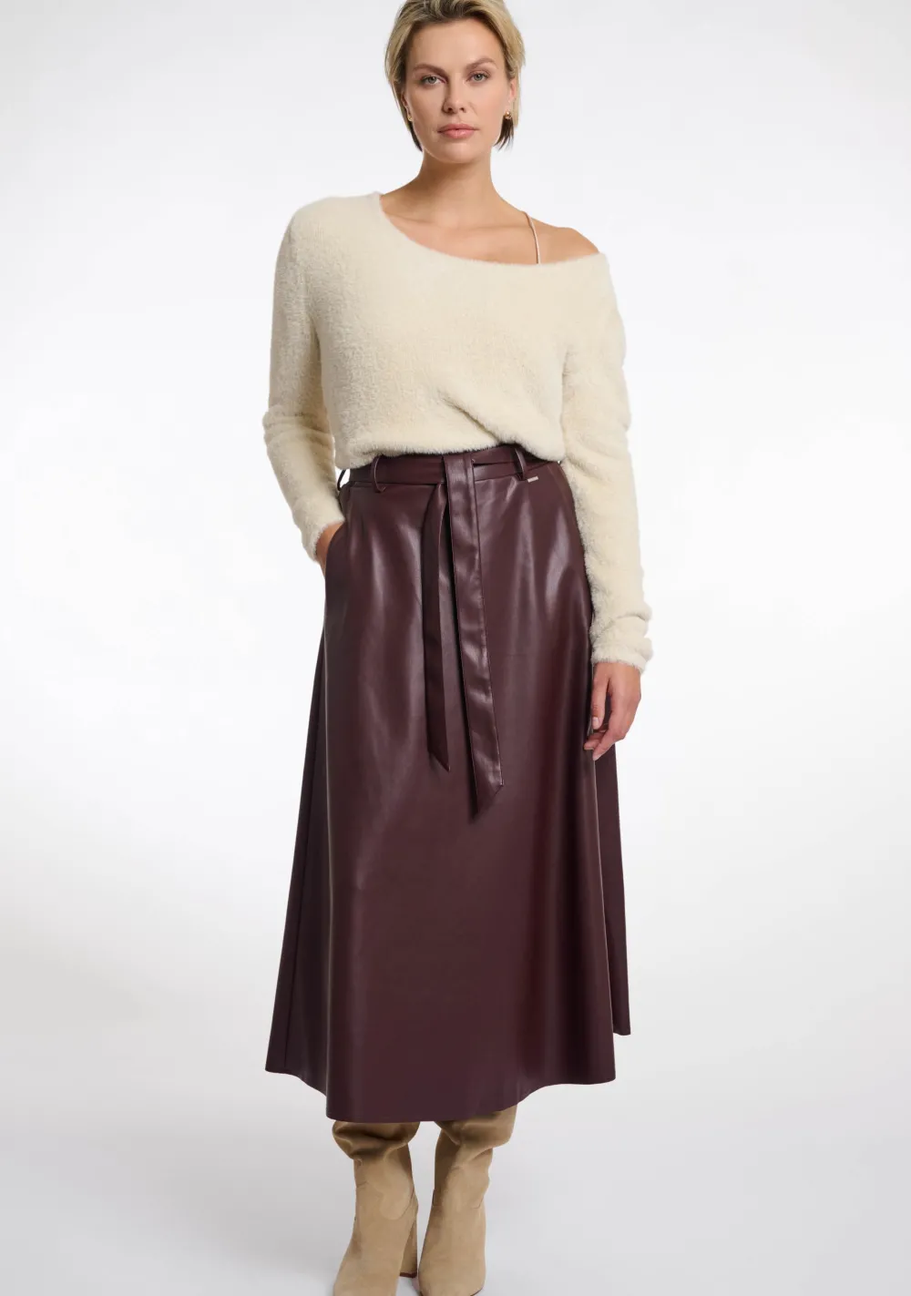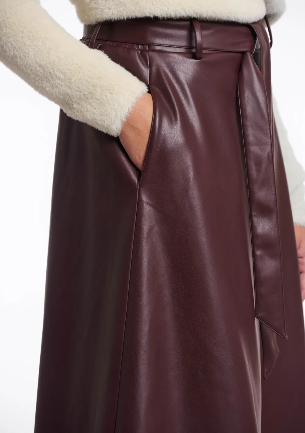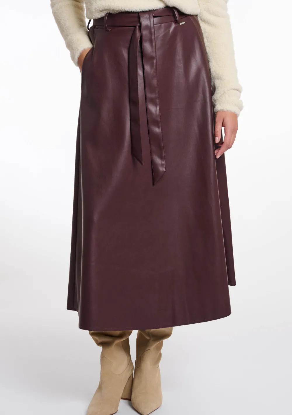 – Vegan leather rok voorzien van steekzakken en een ceintuur in de taille