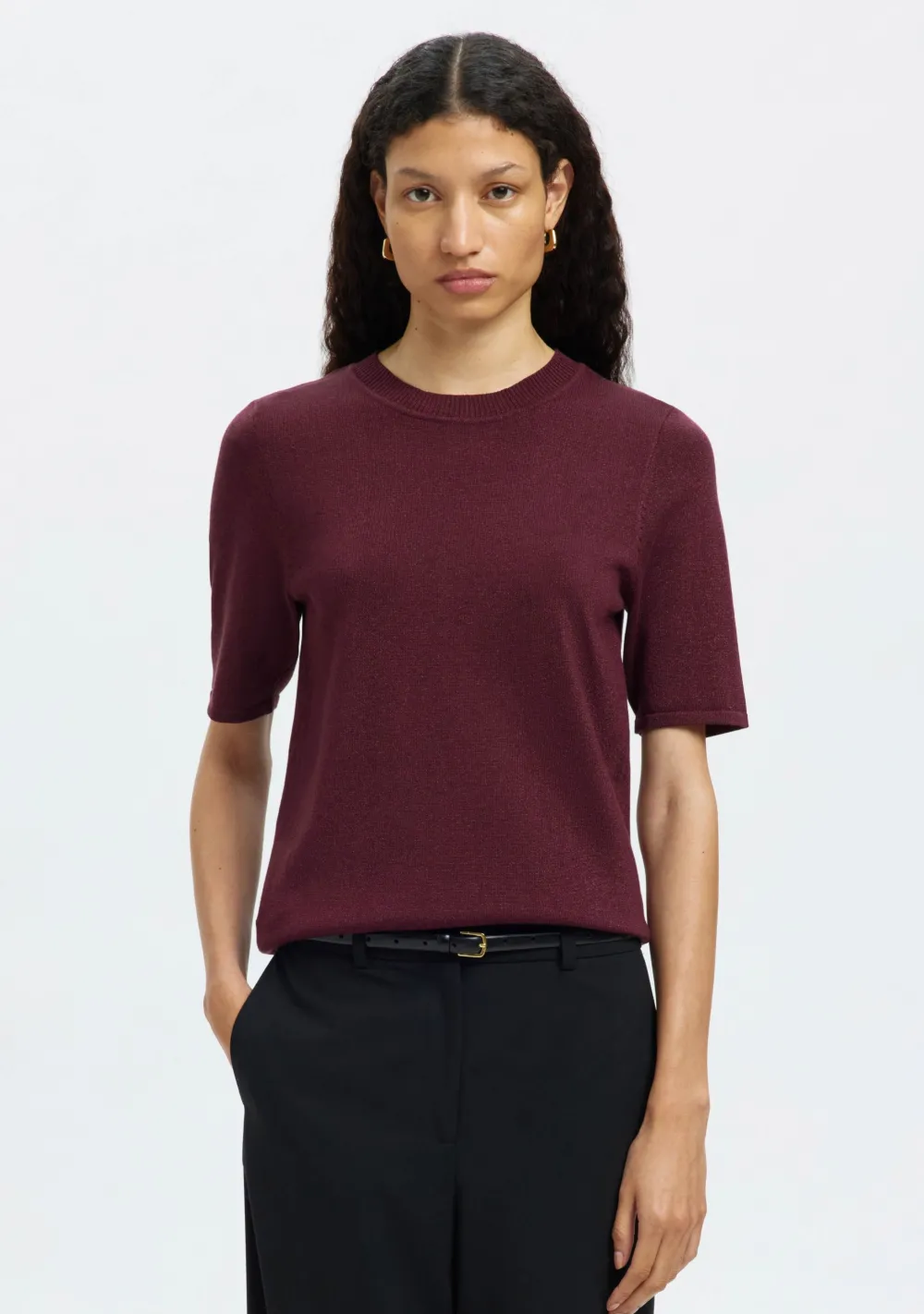 – Het model is 1.76m lang en draagt maat S