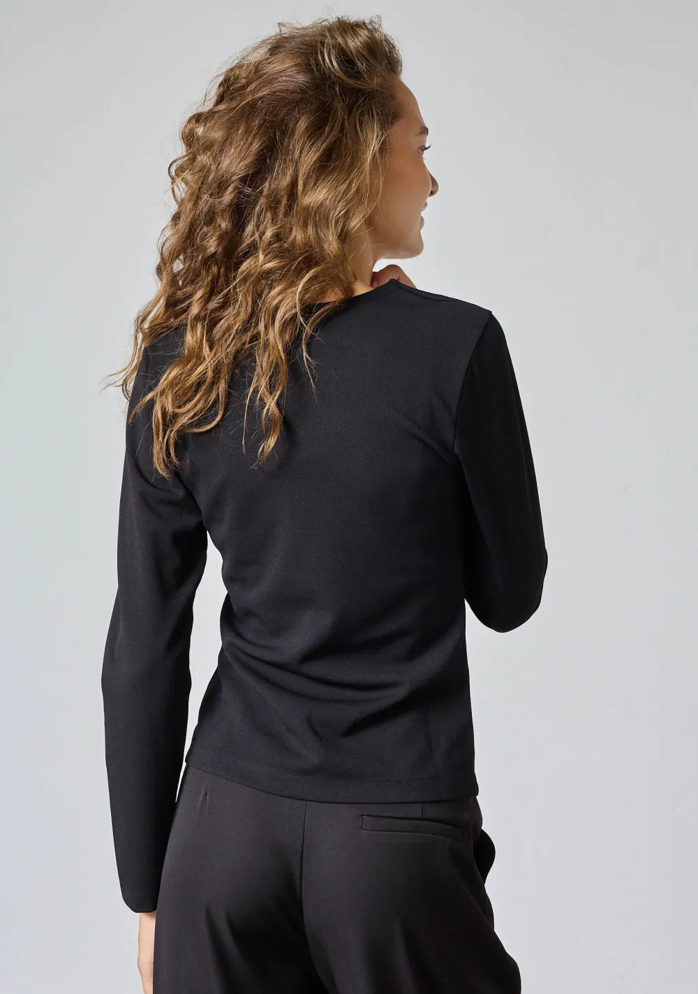 – Het model is 1.76m lang en draagt maat S