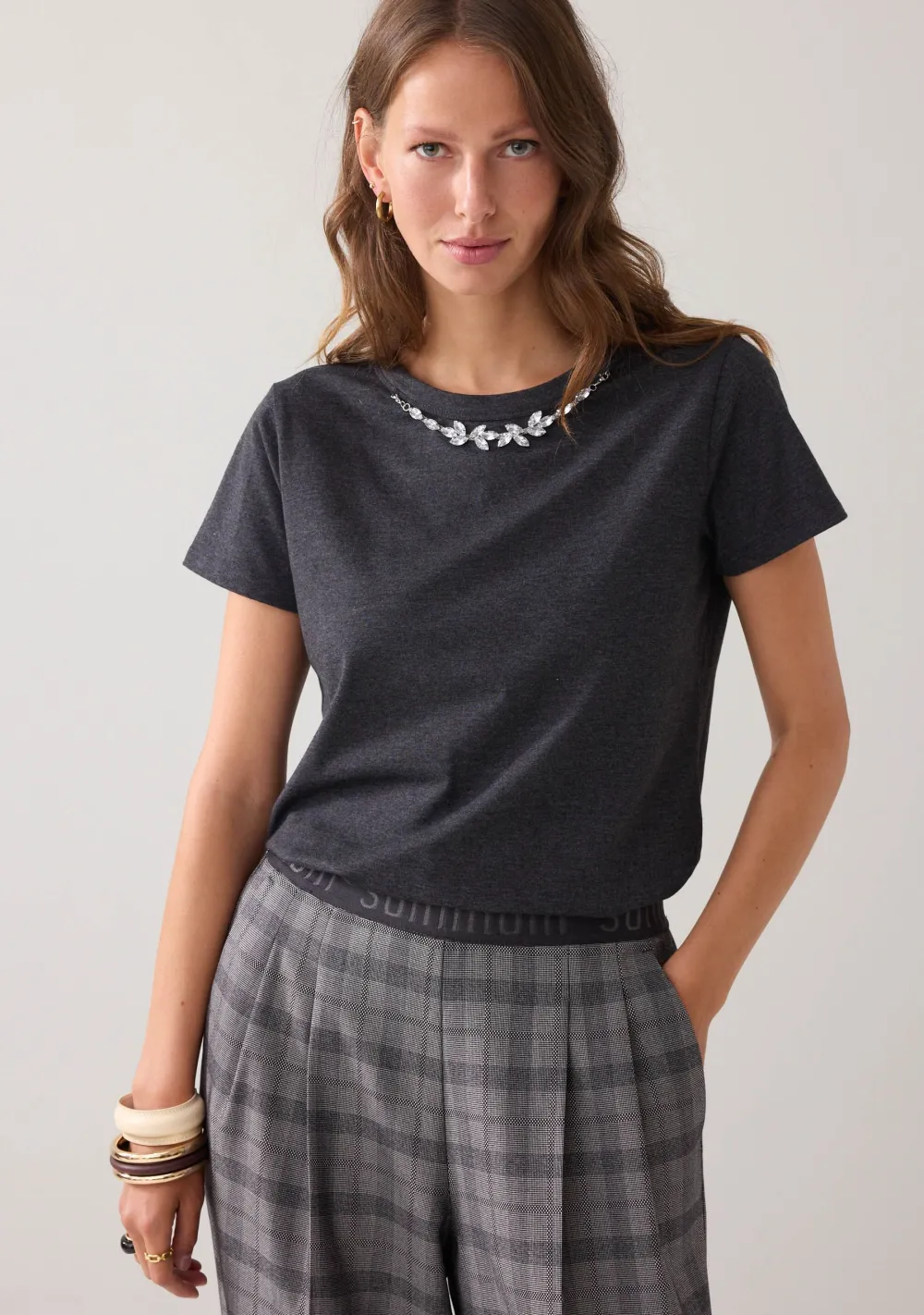 – Het model is 1.76m lang en draagt maat S