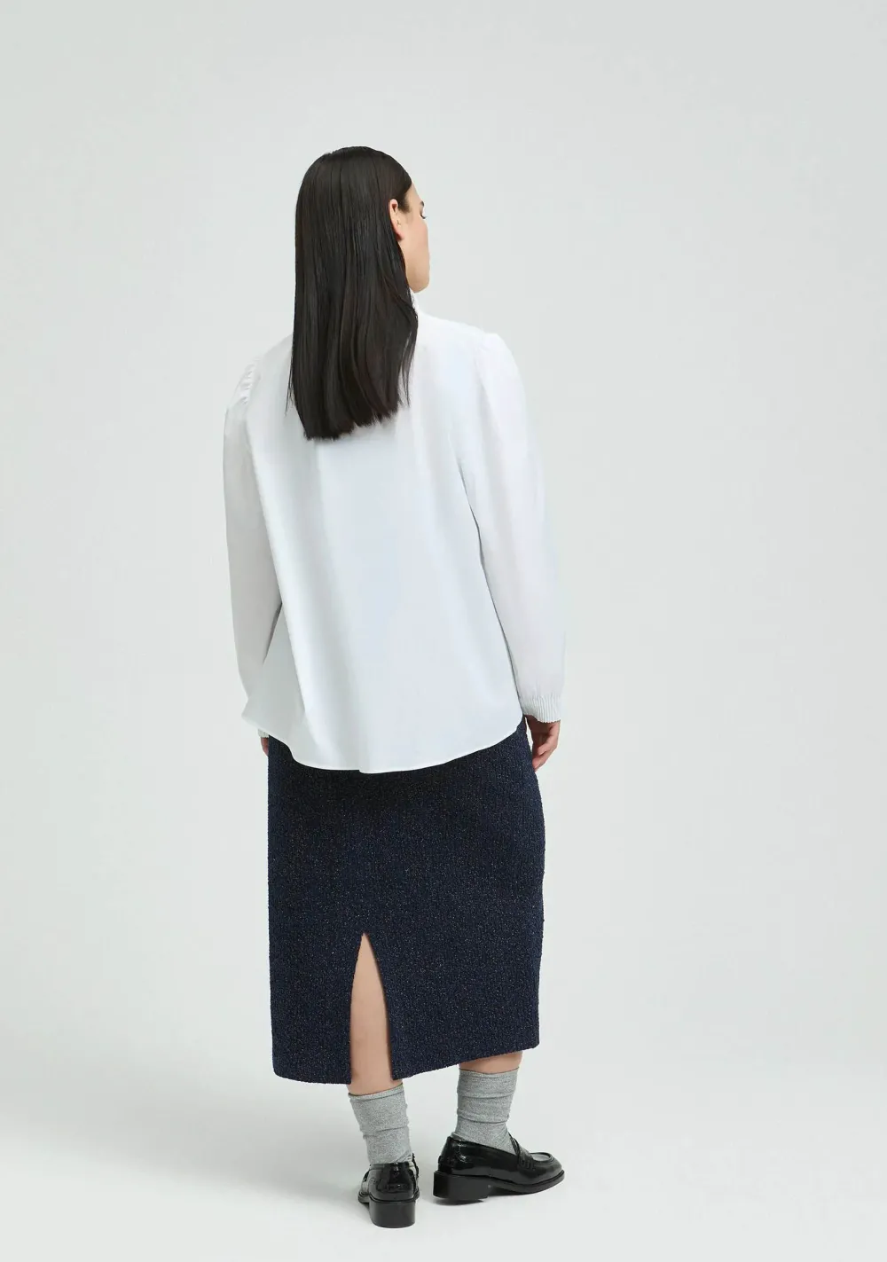 – Het model is 1.76m lang en draagt maat 38