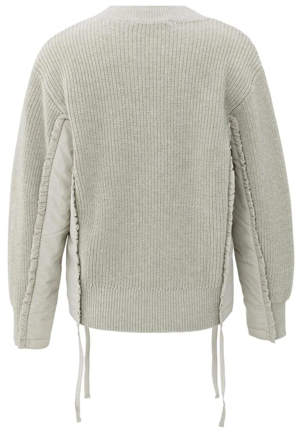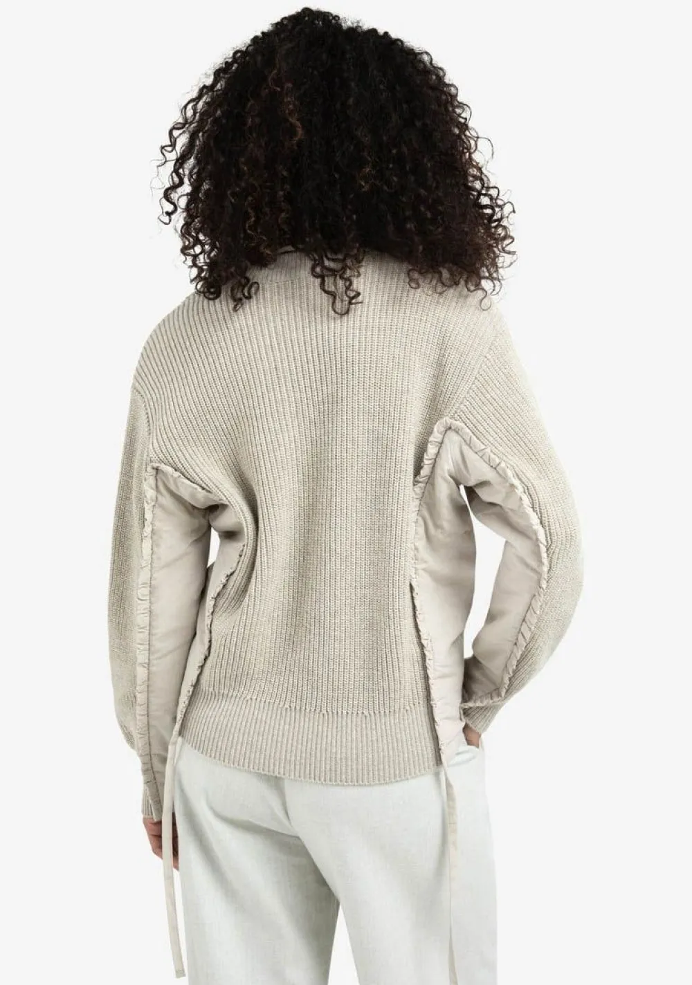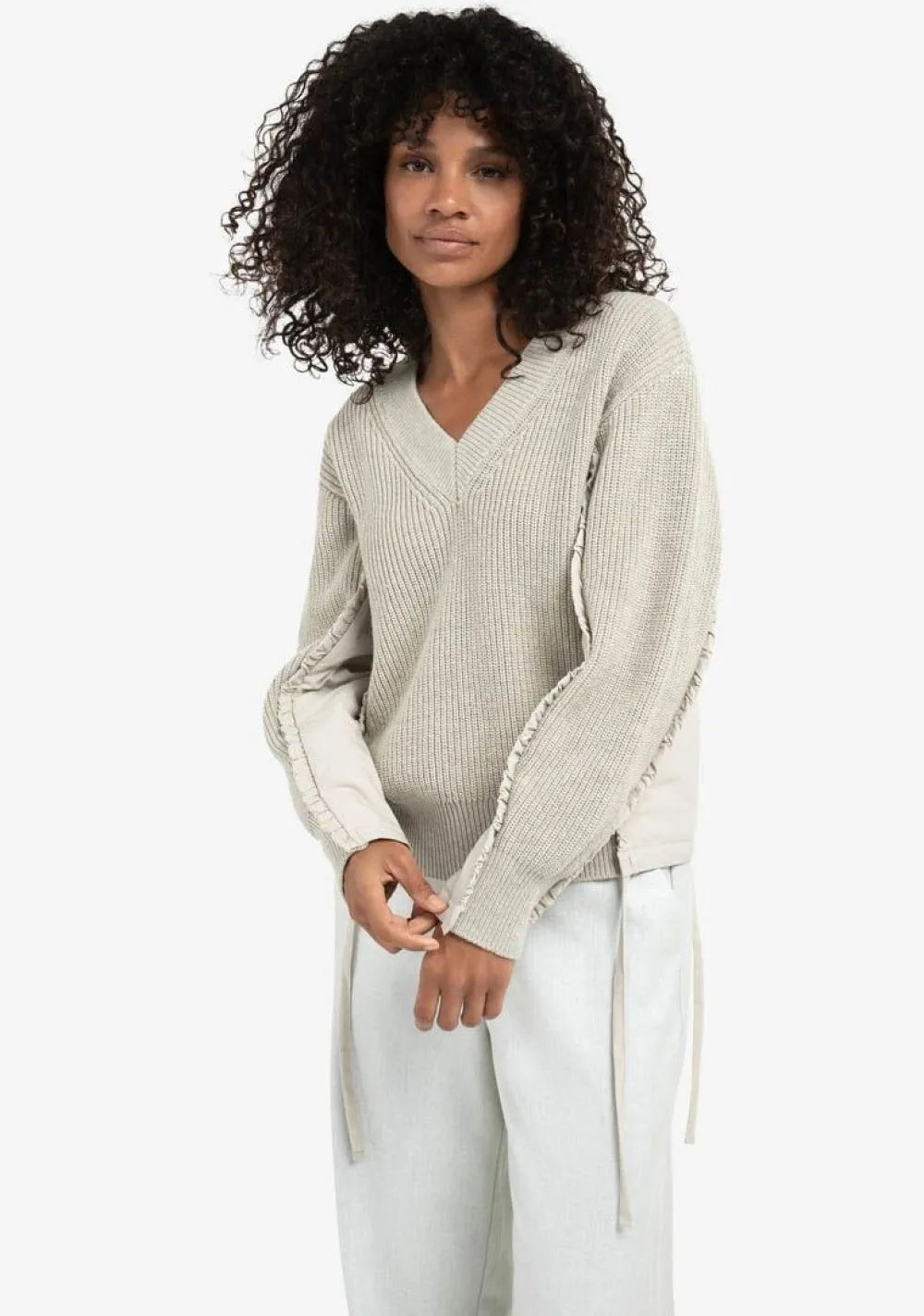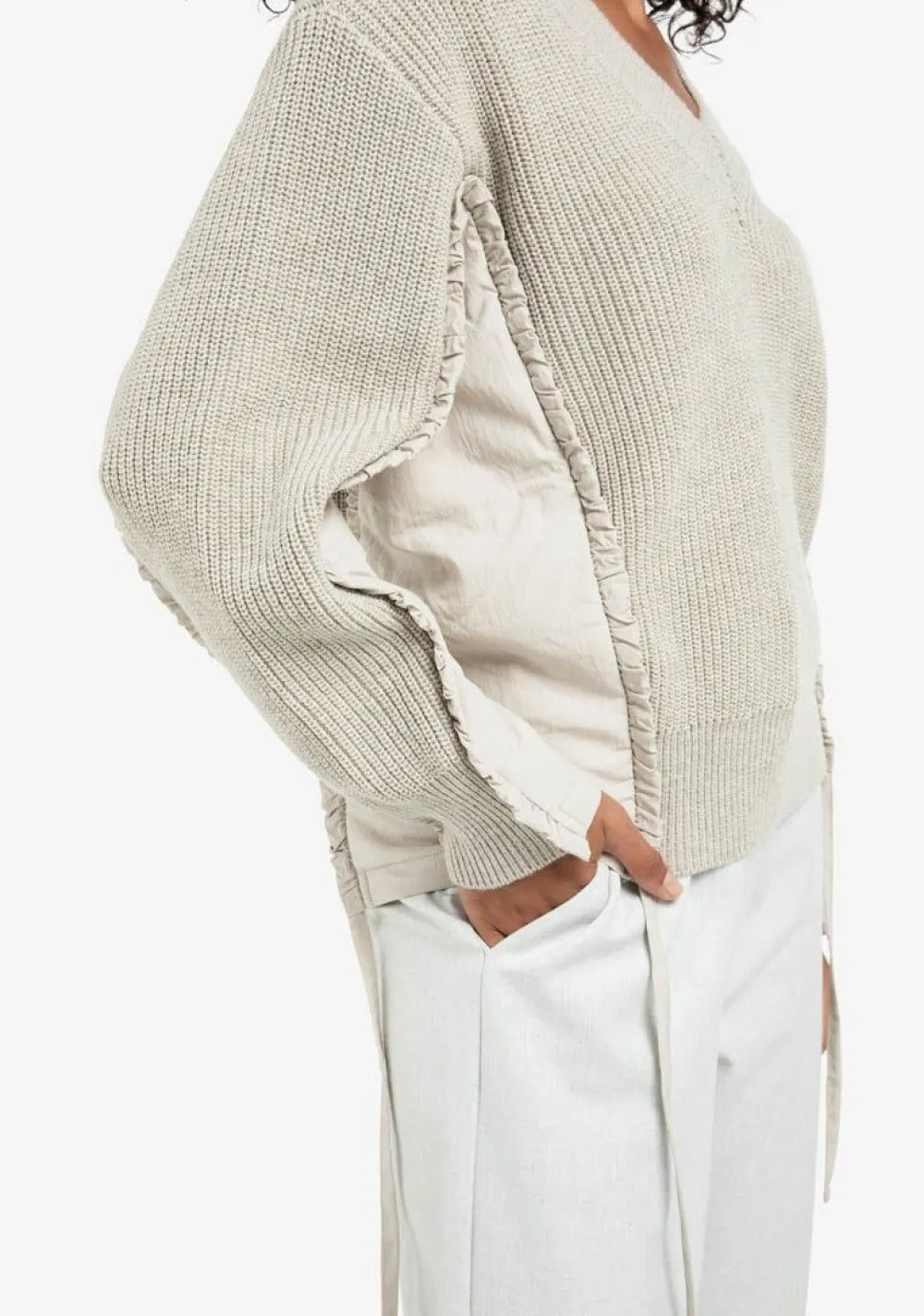 – Trui, afgewerkt in verschillende stoffen/structuren, is voorzien van een speels strikdetail in de zijnaad