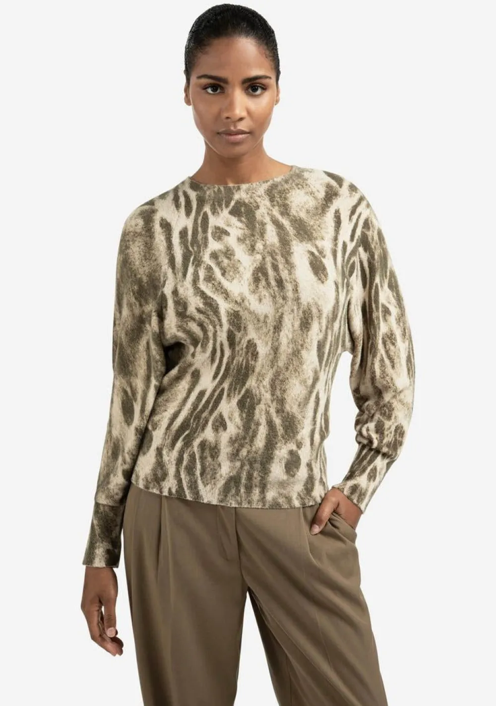 – Het model is 1.76m lang en draagt maat S
